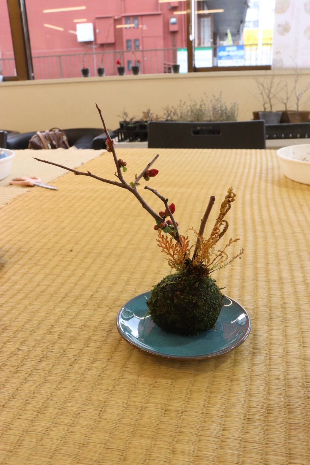 当日は、長寿梅・ボケ・香丁木を題材に、長寿梅を中心に盆栽としての形を整え、苔を敷き、全体のバランスを調整していきました。